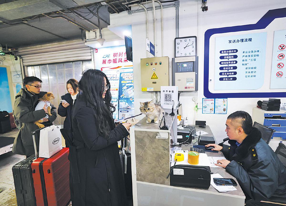 进入春运高峰以来,中铁快运北京南站营业部每天都要负责三四十只宠物猫狗的托运业务,预计高峰日能达到五十只以上,多趟具备宠物托运能力的高铁列车都处于宠物舱位饱和状态。